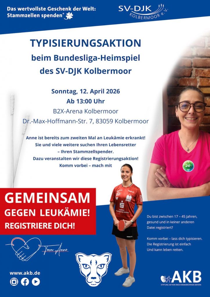 Der Verein kündigt noch etwas Wichtiges für den Sonntag an – es gibt eben auch Begebenheiten und Situationen, die ungleich wichtiger sind als sportliche Erfolge. Auch hier lassen wir Dr. Fuchs zu Wort kommen: „Im Rahmen unseres Spiels am Sonntag richtet unsere Tischtennisabteilung zusammen mit der AKB (Aktion Knochenmarkspende Bayern) zusätzlich eine Typisierungsaktion aus – in der Hoffnung, für eine zum zweiten Mal an Leukämie erkrankte Kolbermoorerin einen passenden Stammzellenspender zu finden. Allen, die sich typisieren lassen, geben wir 50 Prozent Rabatt auf den Eintritt zum Bundesligaspiel.“