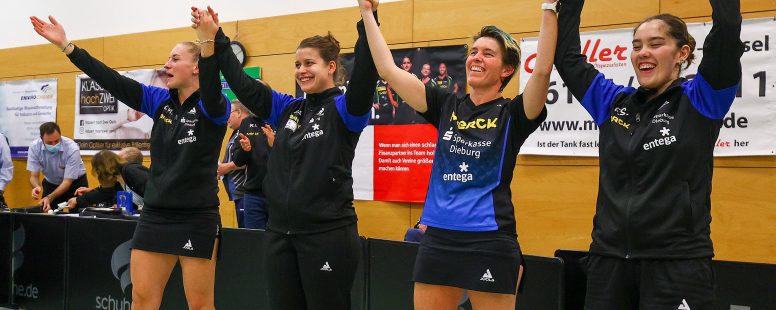 Beitragsbild: Der TSV Langstadt hat Tischtennisgeschichte geschrieben und durfte in sieben Jahren viele Siege in der 1. Bundesliga Damen bejubeln. Nun geht diese Ära zu Ende. Foto von 2021 nach einer gewonnenen Bundesligapartie, v.l. Chantal Mantz, Petrissa Solja, Tanja Krämer, Franziska Schreiner (Archivfoto: Dr. Stephan Roscher).